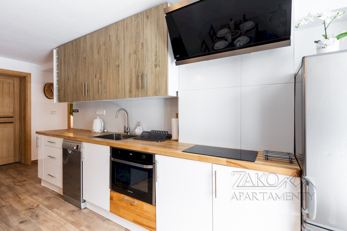 W pełni wyposażona kuchnia - lodówka, płyta ceramiczna, piekarnik, zmywarka, czajnik, naczynia, garnki, sztućce, ekspres do kawy.